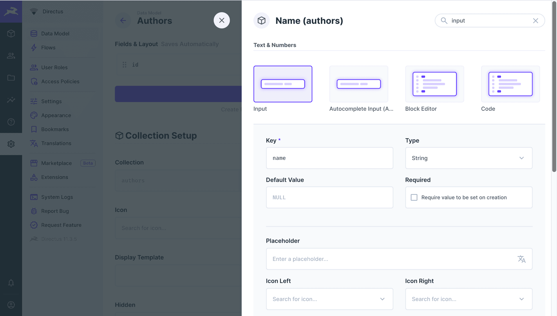 Configure the authors schema in Directus CMS