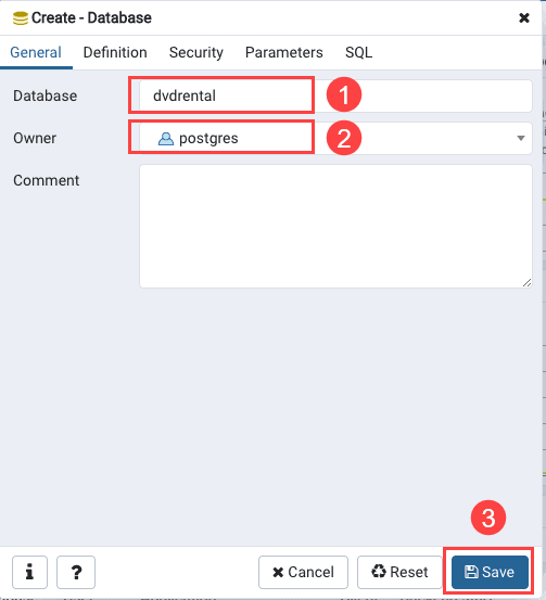 Fourth, enter dvdrental as the database, postgres as the owner, and click the Save button to create the dvdrental database.